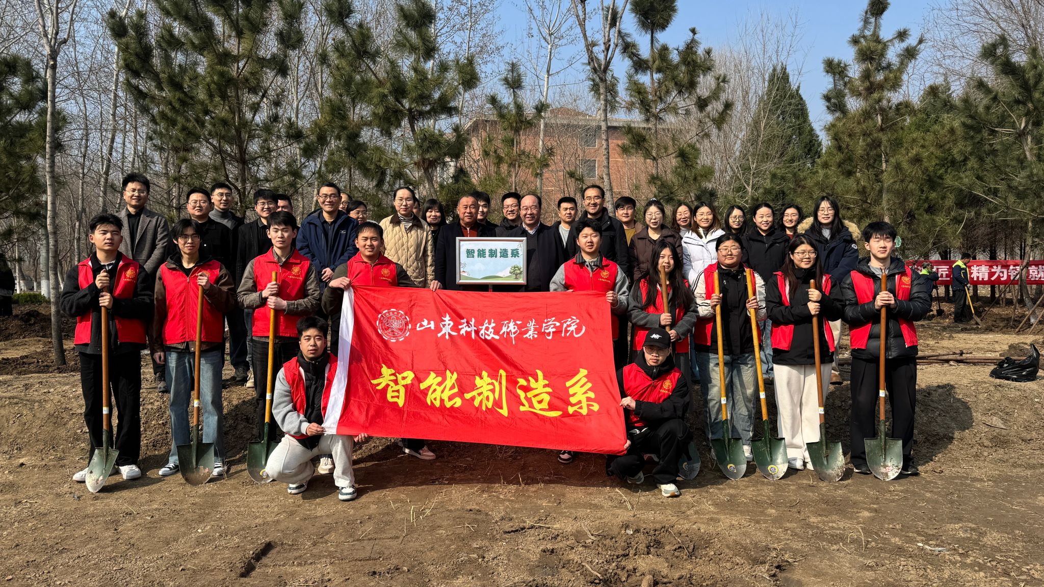春回大地万物苏,植树添绿正当时。2026年3月12日上午,智能制造系师生代表在20-22号楼公寓西侧开展“履行植树义务,共建美丽校园”为主题的义务植树活动,以实际行动为校园增添新绿。