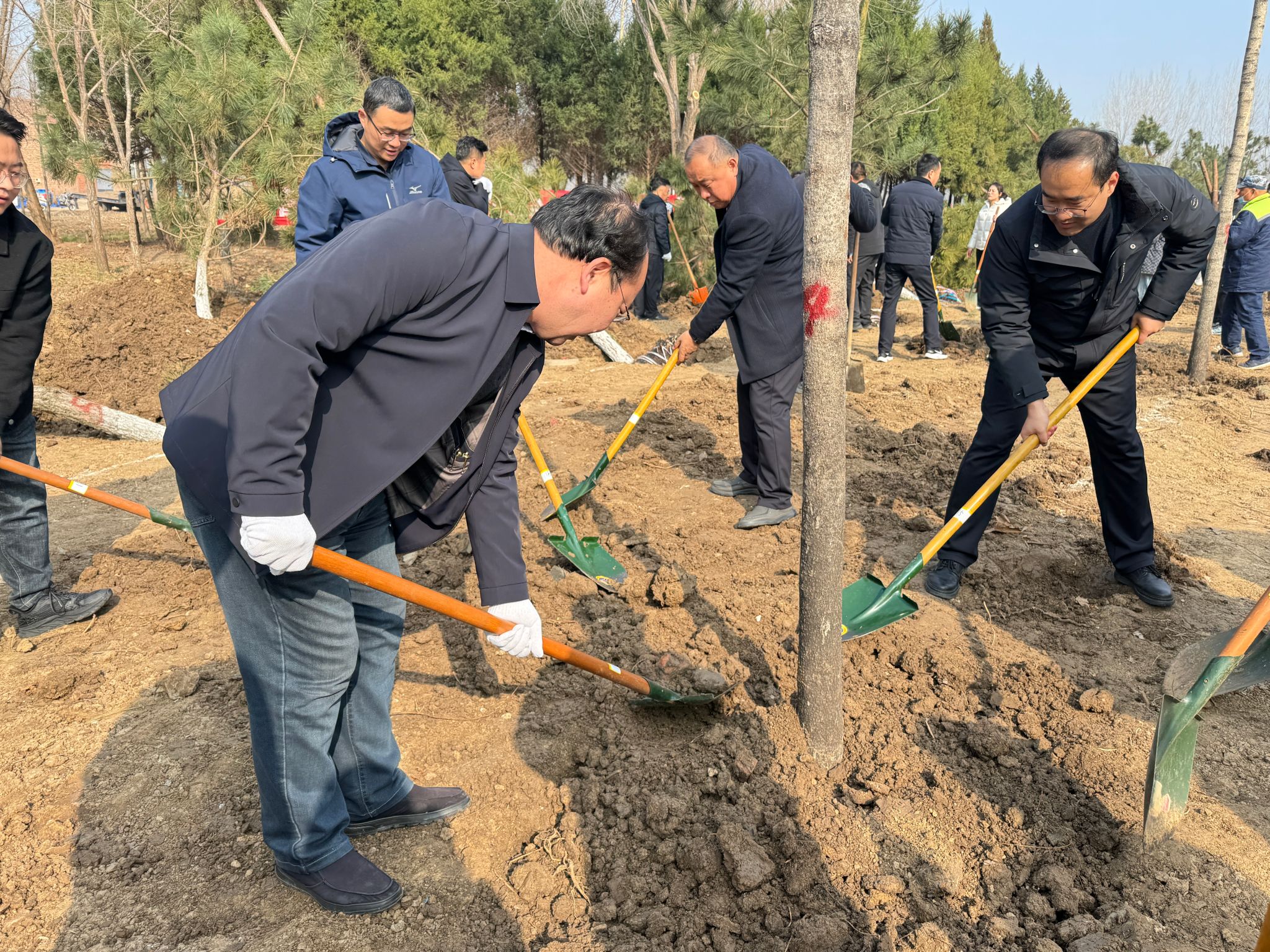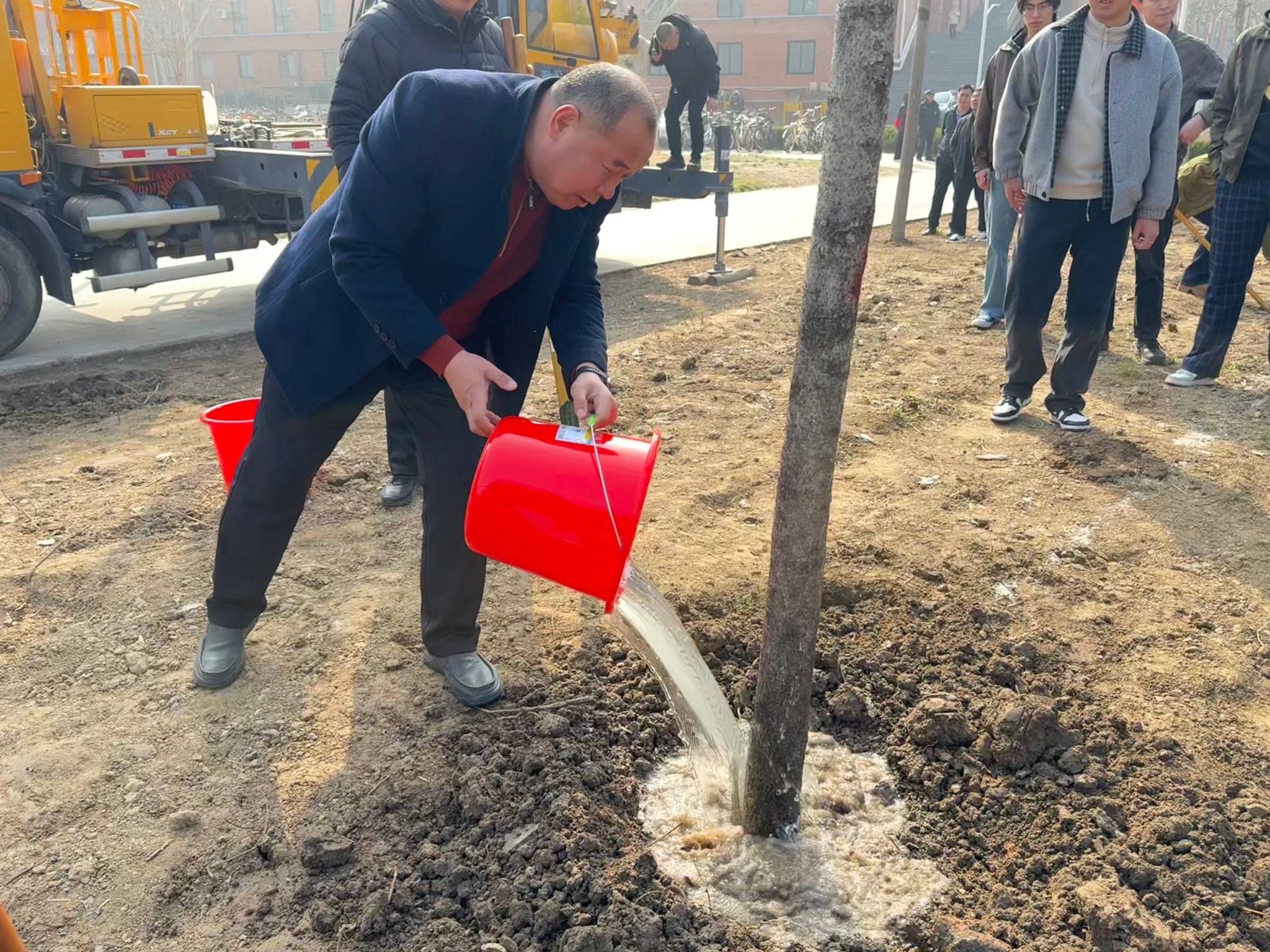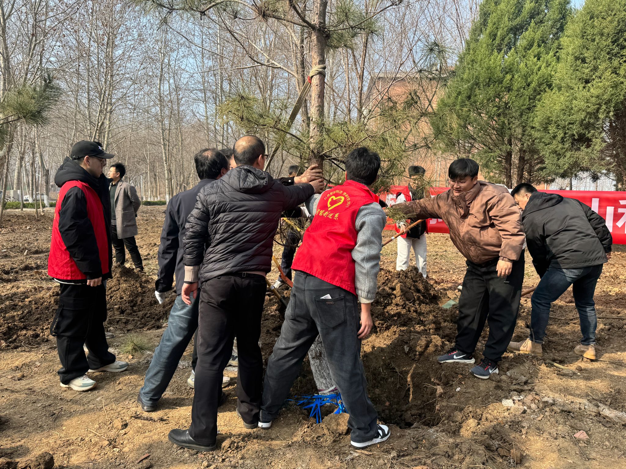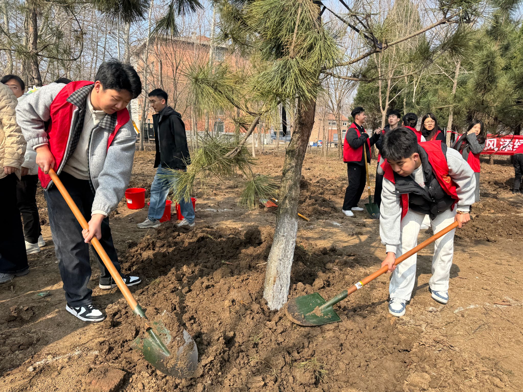 活动现场,我系师生一起挥锹铲土、扶苗填坑、提水浇灌,大家分工协作、干劲十足,一派热火朝天的劳动景象。经过一个多小时的辛勤劳作,数十株树苗在春风中昂然挺立,原本空旷的土地焕发出勃勃生机,为初春的校园增添了勃勃生机。